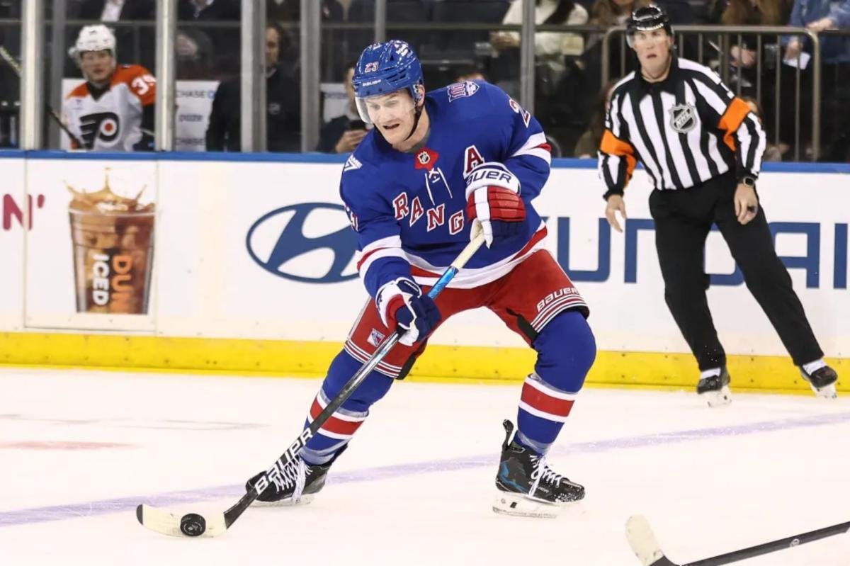 Adam Fox cerca di fare un passaggio durante la sconfitta per 3-2 dei Rangers ai supplementari contro i Flyers at the Garden il 26 febbraio 2026.