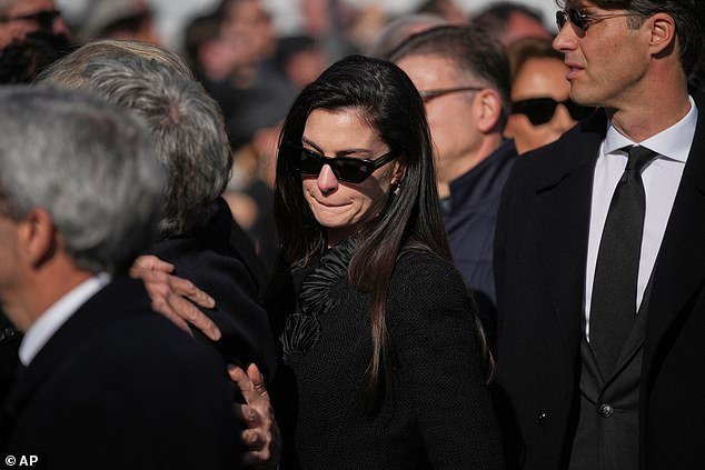 Anne Hathaway è rimasta in lacrime mentre lei, Donatella Versace e Tom Ford hanno tagliato figure cupe mentre guidavano le persone in lutto rendendo omaggio a Valentino Garavani al suo funerale a Roma