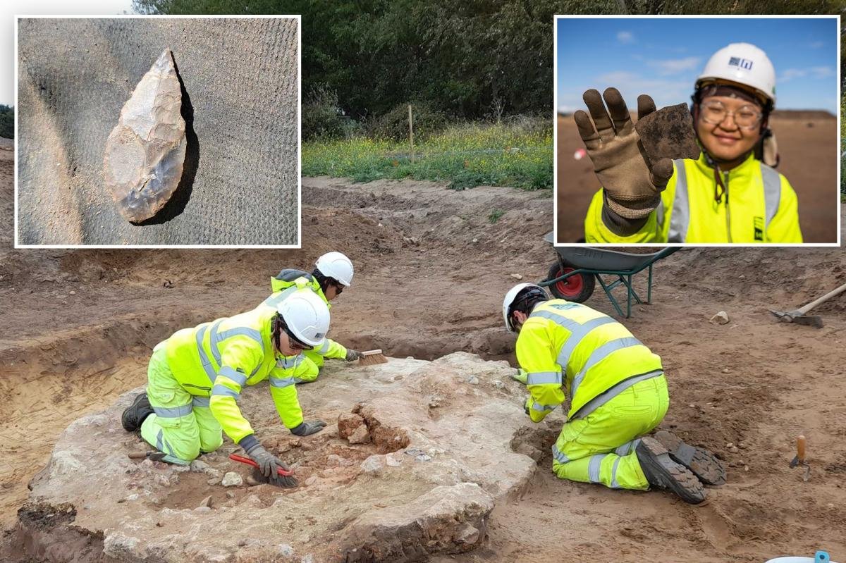 Le immagini dello scavo mostrano gli archeologi che tengono in mano alcuni degli antichi manufatti scoperti, tra cui strumenti di selce e frammenti di ceramica.
