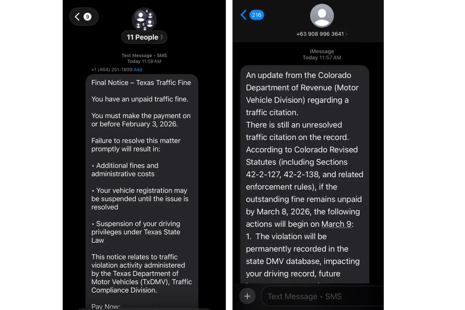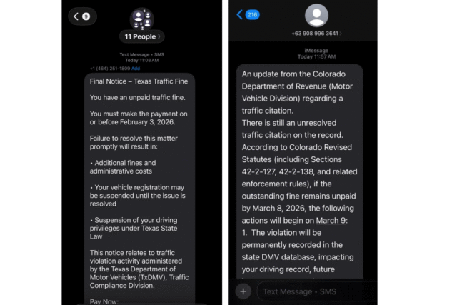 La Divisione dei veicoli a motore del Colorado ha avvertito che i truffatori si stanno spacciando per l’agenzia e affermano falsamente che i destinatari hanno biglietti non pagati. I testi fraudolenti minacciano procedimenti giudiziari, la sospensione dell’immatricolazione del veicolo o la revoca dei privilegi di guida e includono collegamenti a siti Web che imitano i portali ufficiali dello stato.