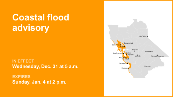 Bay Area Shorelines è al centro di un avviso di inondazione costiera emesso lunedì alle 2:38 dal Servizio meteorologico nazionale. L’avviso è valido da mercoledì alle 5 fino a domenica 4 gennaio alle 14