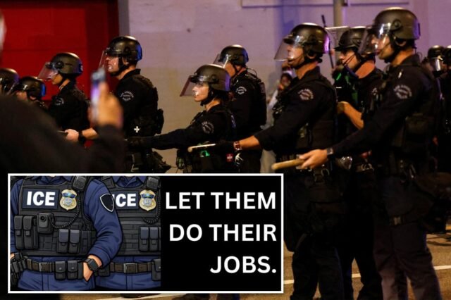“Lasciateli fare il loro lavoro”, si legge in un altro cartello, che include illustrazioni di agenti ICE in equipaggiamento tattico.