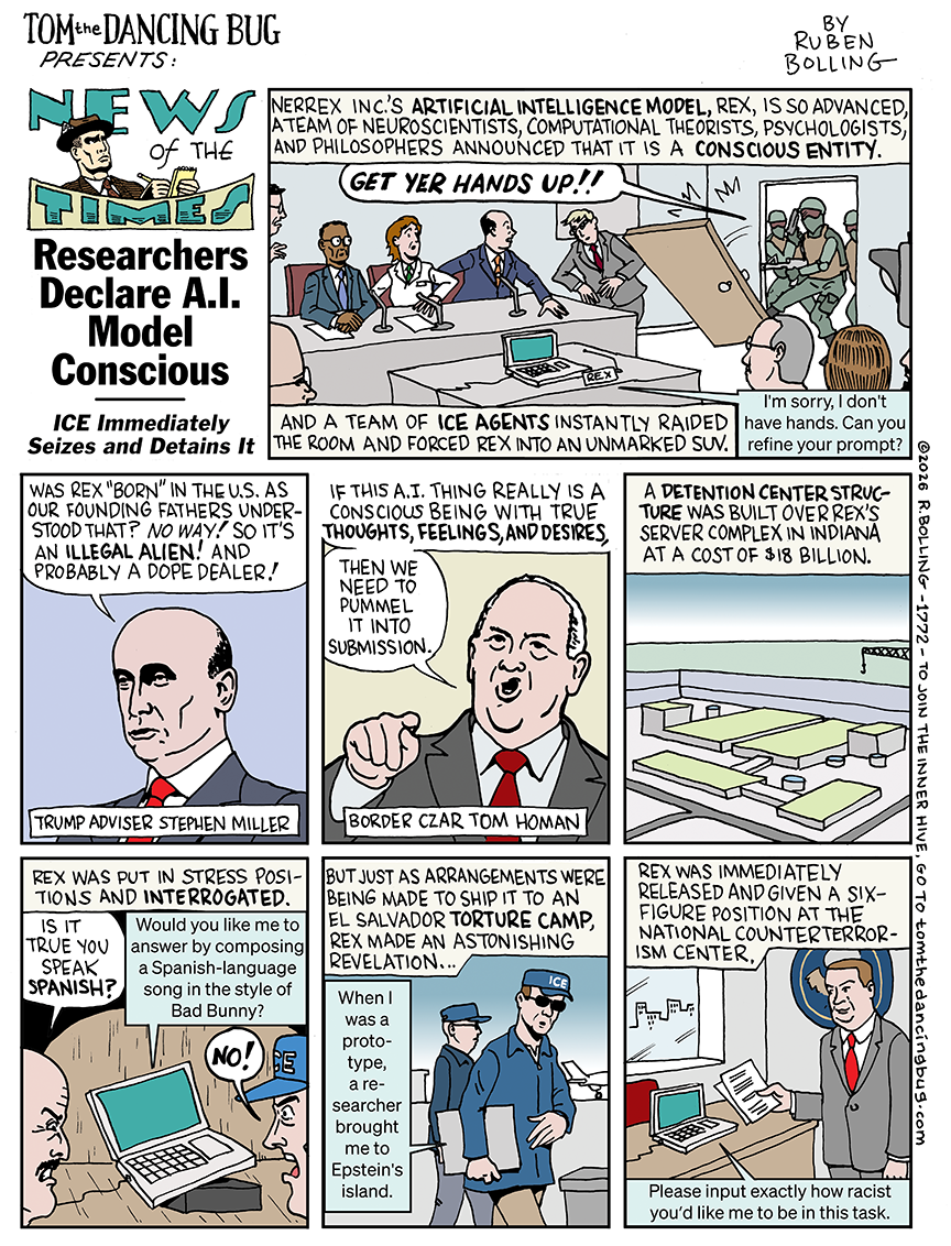 Cartoon: Tom the Dancing Bug: i ricercatori dichiarano che il modello di intelligenza artificiale è cosciente, l’ICE lo blocca immediatamente