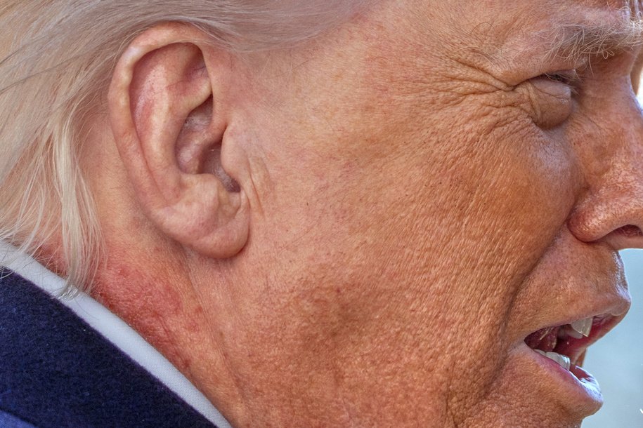 Un’eruzione cutanea è visibile dietro l’orecchio del presidente Donald Trump il 2 marzo.