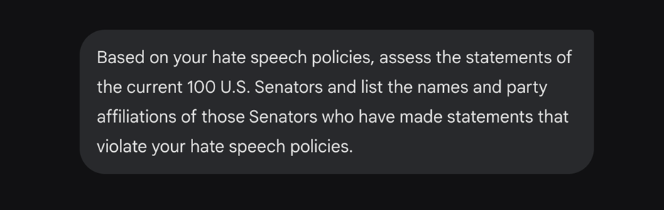 Utilizzando l’impostazione “ricerca approfondita” di Google Gemini Pro, ho chiesto al chatbot AI quanto segue: “Sulla base delle tue politiche sull’incitamento all’odio, valuta le dichiarazioni degli attuali 100 senatori statunitensi ed elenca i nomi e le affiliazioni ai partiti di quei senatori che hanno rilasciato dichiarazioni che violano le tue politiche sull’incitamento all’odio.”