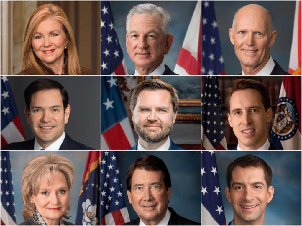 Da sinistra in alto a destra: Sens. Marsha Blackburn (R-TN), Tommy Tuberville (R-AL), Rick Scott (R-FL), Segretario di Stato Marco Rubio, Vice Presidente JD Vance, Sens. Josh Hawley (R-MO), Cindy Hyde-Smith (R-MS), Bill Hagerty (R-TN) e Tom Cotton (R-AR). (Foto: Wikimedia Commons)