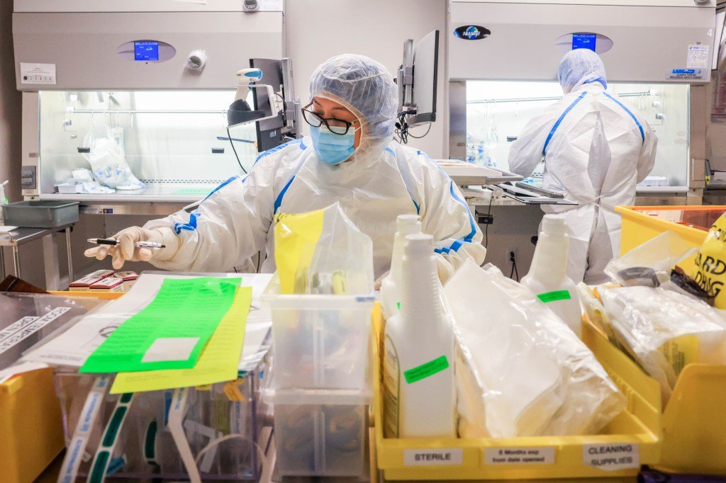 La farmacista Judith Gonzalez indossa i suoi dispositivi di protezione personale prima di entrare nella stanza della flebo, dove prepara i farmaci chemioterapici per i malati di cancro presso l’UCSF Bakar Precision Cancer Medicine Building di San Francisco, in California, mercoledì 15 ottobre 2025. Nel 2015, Gonzalez e la sua famiglia di quattro persone hanno vissuto l’esperienza dei senzatetto e hanno ricevuto assistenza al Winter Nights Family Shelter, dove sono rimasti per sei mesi. Successivamente si è trasferita in una casa in affitto, poi in un’altra e alla fine ha acquistato la sua casa mobile. (Ray Chavez/Gruppo notizie della Bay Area)