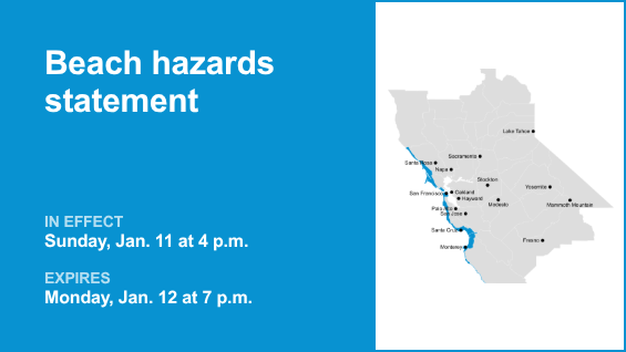 La costa settentrionale della baia, compresa la costa nazionale di Point Reyes, la costa della penisola di San Francisco, la baia settentrionale di Monterey, la baia meridionale di Monterey e la costa di Big Sur, nonché la contea di San Francisco, sono al centro di una dichiarazione sui rischi sulla spiaggia rilasciata alle 12:01 di domenica dal Servizio meteorologico nazionale. La dichiarazione è valida dalle 16:00 fino a lunedì 12 gennaio alle 19:00