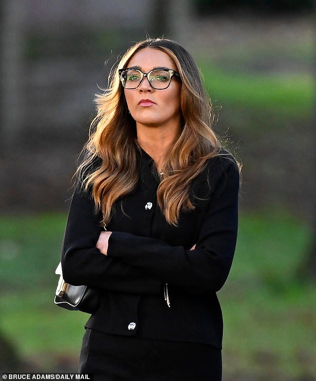 Hannah Greenhalgh, rimasta vedova appena tre mesi dopo il suo matrimonio a Las Vegas con il pilota di Ryanair Matt Greenhalgh, nella foto fuori dall’udienza alla pretura di Warrington