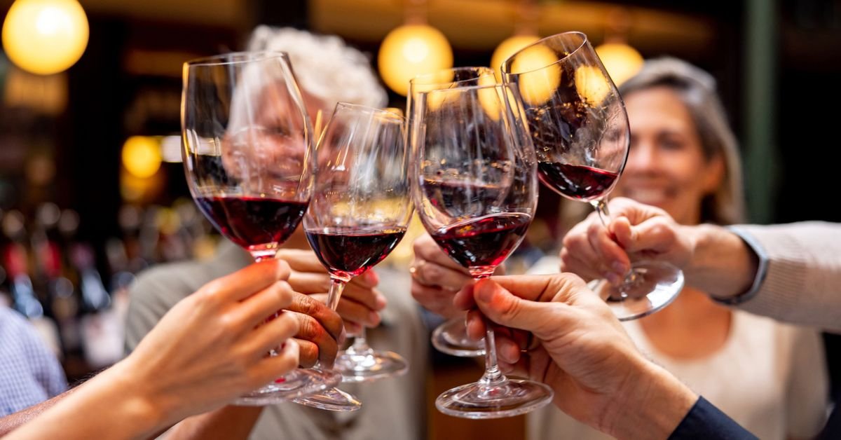 Primo piano di un gruppo felice di persone che brindano durante una degustazione di vini
