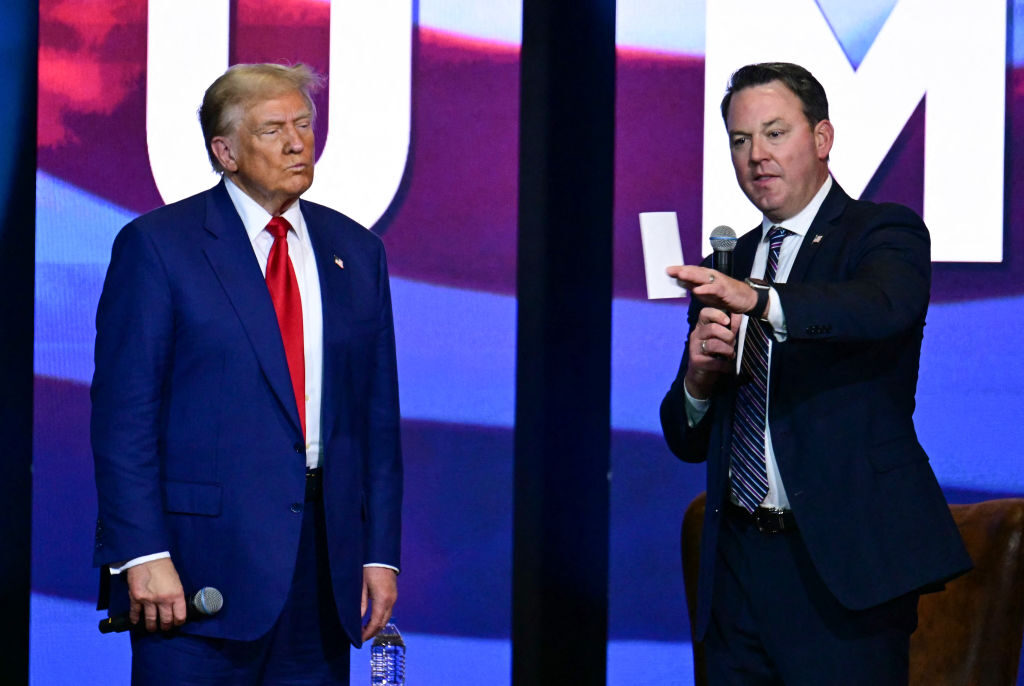 File/Donald Trump parla durante un municipio “Believers and Ballots Faith” con il vicegovernatore della Georgia Burt Jones(R) a Zebulon, Georgia, il 23 ottobre 2024. (JIM WATSON/AFP tramite Getty)