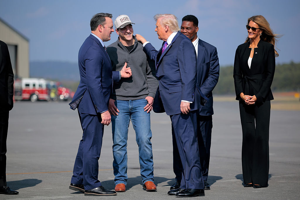 Il vicegovernatore della Georgia Burt Jones, il Gunner Stockton n. 14 dei Georgia Bulldogs, il presidente degli Stati Uniti Donald Trump, Herschel Walker e Kelly Loeffler della US Small Business Administration all’aeroporto regionale di Russell il 19 febbraio 2026 a Roma, Georgia. (Chip Somodevilla/Getty)