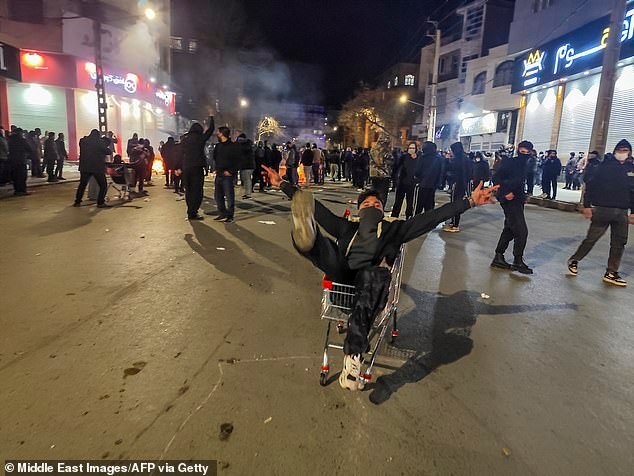 I manifestanti anti-regime festeggiano mentre prendono il controllo delle strade nella città di Kermanshah, nell’Iran occidentale, questa settimana mentre le proteste dilagano nella nazione