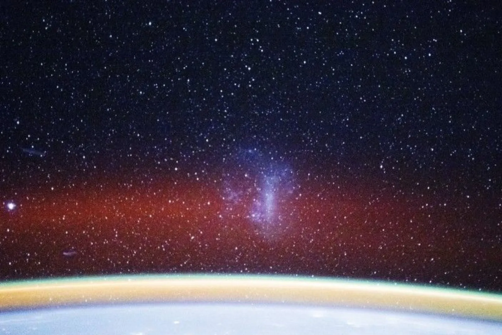 La fotografia, scattata il 28 novembre 2025 dal laboratorio orbitante, mostra la galassia nana come una scintillante macchia viola nel cielo pieno di stelle, sospesa sopra la Terra. Terral’arto.