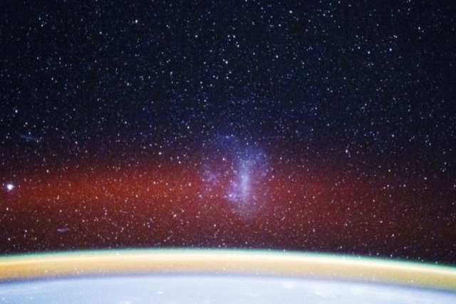 Nella foto della ISS, nella parte inferiore si vede un’ampia fascia dell’atmosfera superiore della Terra, che brilla di strati di bagliore giallo, verde e rosso diffuso.