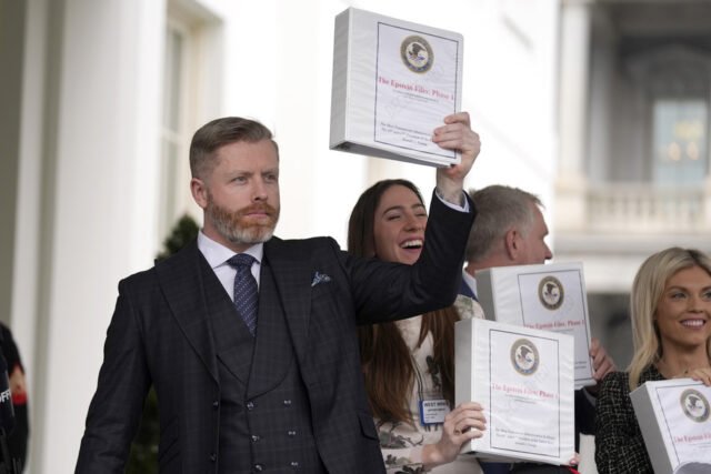 Chaya Raichik, creatore di Libs of TikTok, è affiancato dal commentatore di destra Rogan O’Handley, noto anche come DC Draino, mentre sollevano raccoglitori con una copertina intitolata “The Epstein Files: Phase 1” alla Casa Bianca il 27 febbraio.