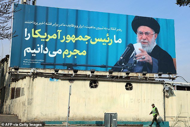 Nella foto: un cartellone pubblicitario che mostra il leader supremo dell’Iran, l’Ayatollah Ali Khamenei, con la retorica anti-americana scritta accanto a lui in Iran