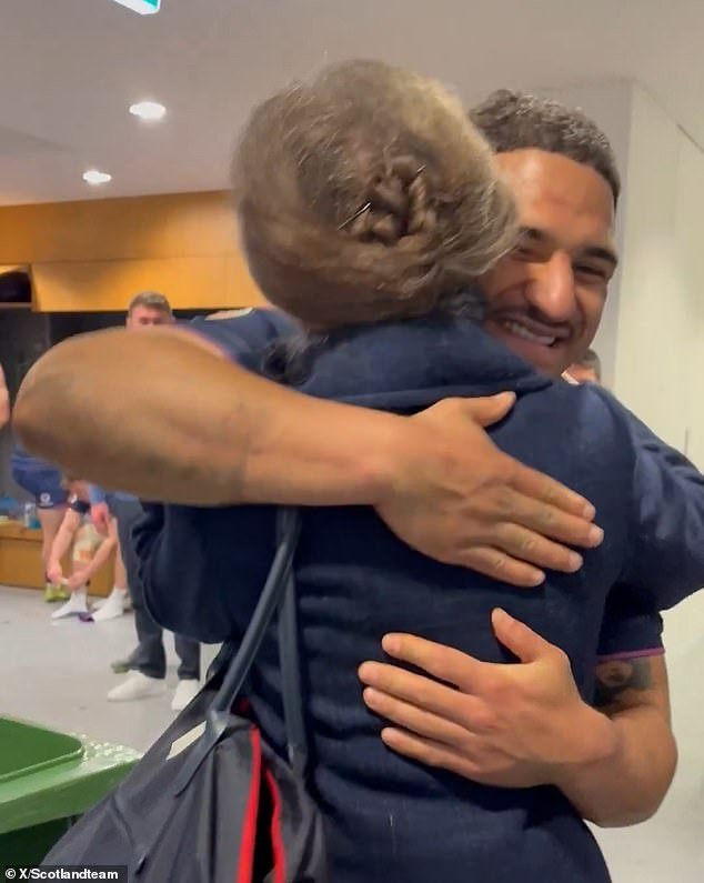 Intitolata “Sione finalmente riceve il suo abbraccio”, la clip vedeva la coppia abbracciarsi brevemente prima di scambiare alcune parole e apparentemente risate per concludere un torneo piuttosto di successo per la Scozia.