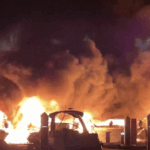 Sul posto sono intervenute le squadre dei vigili del fuoco che domavano l’incendio, con un cordone di polizia allestito sul posto
