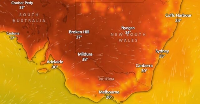 L’aria calda oggi presente sull’Australia Meridionale e sul Victoria sta portando le temperature oltre i 30 gradi e aumentando gli allarmi di pericolo di incendio. (Windy.com) (In dotazione)