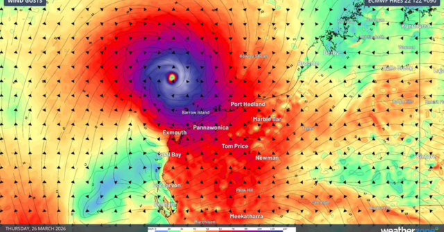 “Una volta che ci dirigeremo verso giovedì e venerdì, ci aspettiamo che si intensifichi ulteriormente in un ciclone tropicale grave di categoria 4 prima di curvare attorno alla costa di Exmouth e fare una traiettoria più verso sud-ovest”, ha detto Cherny.