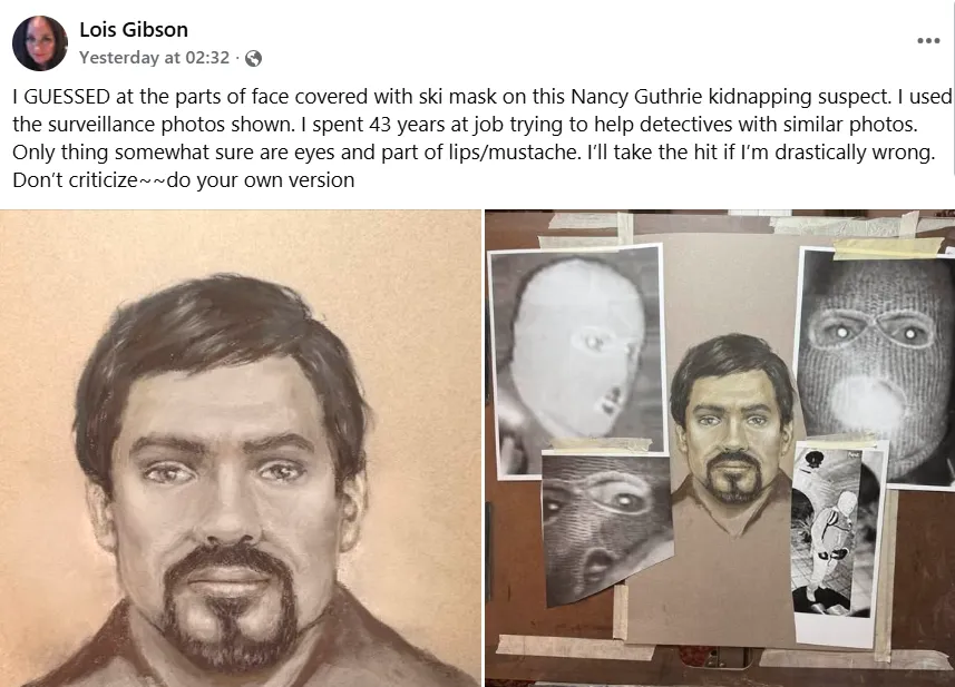 “HO INDOVINATO le parti del viso coperte dal passamontagna di questa sospettata del rapimento di Nancy Guthrie. Ho usato le foto di sorveglianza mostrate”, Lois Gibson, che si è ritirato dal dipartimento di polizia di Houston nel 2021 ed è registrato nel Guinness dei primati come l’artista forense di maggior successo al mondo, ha scritto su Facebook accanto allo schizzo.