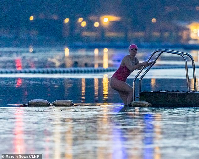 Oggi un membro del Serpentine Swimming Club fa una nuotata mattutina ad Hyde Park