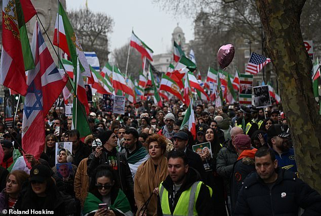 Una grande folla di manifestanti, che il Daily Mail stima fossero circa 2.000, ha marciato da Whitehall fino all’ambasciata iraniana a Kensington.