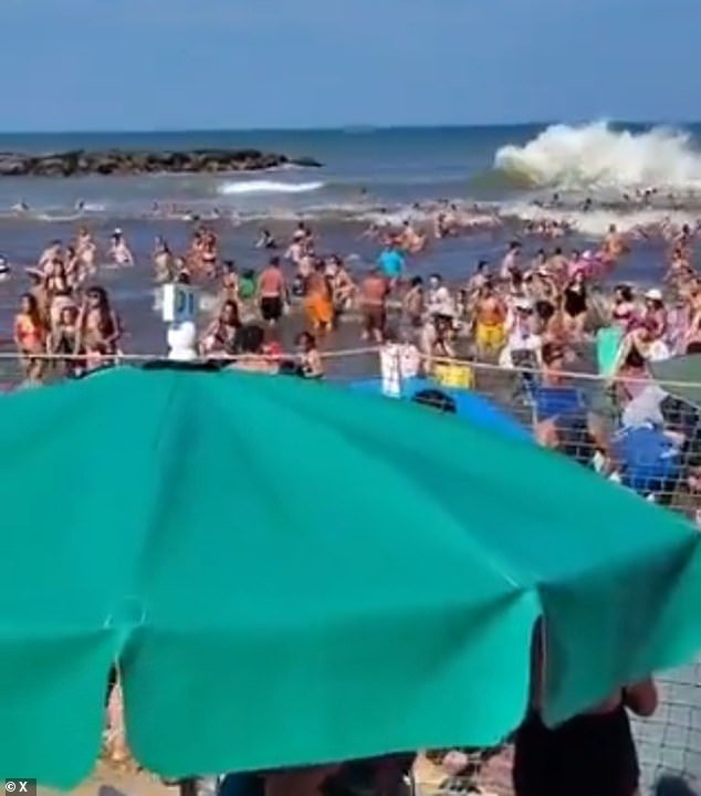 In una clip drammatica girata lunedì pomeriggio nella città costiera di Santa Clara del Mar, si possono vedere rapide ondate d’acqua che spazzano una spiaggia affollata mentre le persone si arrampicano fuori dall’acqua per cercare sicurezza sulla sabbia.