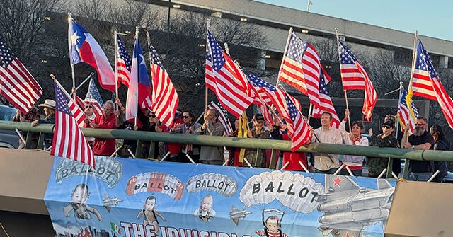 I membri della Dallas 1776 Bridge Brigade tengono le bandiere del Texas e dell’America dopo aver appeso uno striscione dal ponte Northpark Boulevard sulla superstrada US-75 a Dallas, Texas, giovedì 5 febbraio 2026. (Foto per gentile concessione della Dallas 1776 Bridge Brigade)