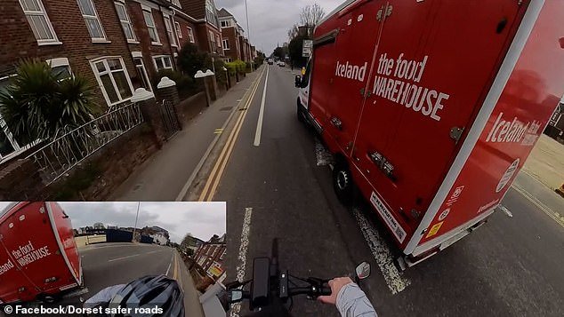 La clip mostra il signor Chapmanlaw, un consigliere eletto liberaldemocratico, che pedala sulla strada, fuori dalla segnaletica di una pista ciclabile designata a Poole, nel Dorset.