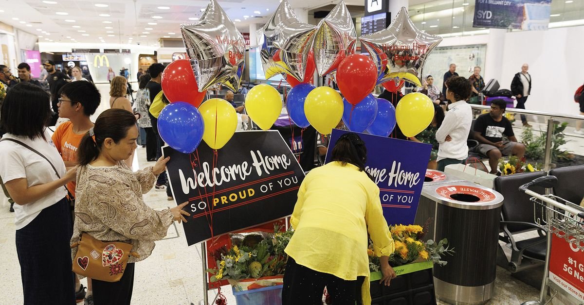 Più di 100 persone aspettavano al cancello degli arrivi con fiori e manifesti in abbondanza Sydney Morning Herald rapporti.