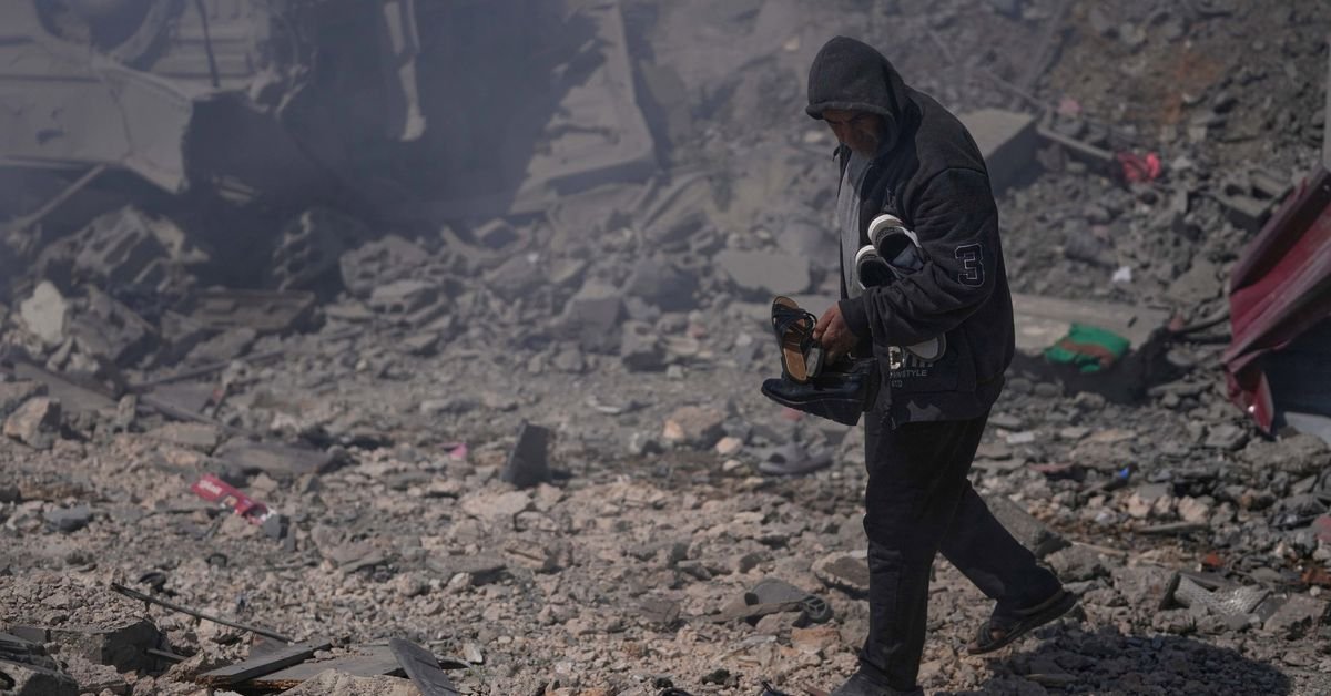 Un uomo porta con sé le scarpe della sua casa distrutta che è stata colpita dagli attacchi aerei israeliani che hanno colpito diverse case nel villaggio di Sir al-Gharbiyeh, nel sud del Libano. (AP)