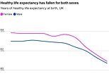Nel Regno Unito, l’aspettativa di vita sana è scesa da quasi 63 anni di dieci anni fa, a 60,7 anni nel 2022-24 per gli uomini e da 63,7 a 60,9 per le donne.