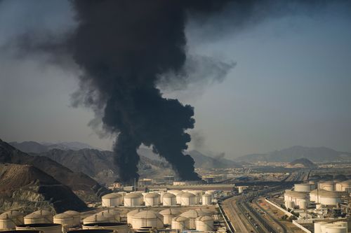 Pennacchi di fumo si alzano da un impianto petrolifero a Fujairah, negli Emirati Arabi Uniti. (AP)