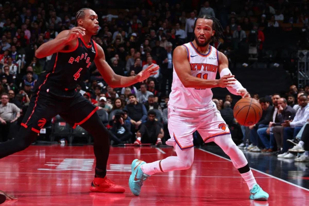 Jalen Brunson cerca di fare un passaggio durante la vittoria in trasferta dei Knicks sui Raptors nei quarti di finale della Coppa NBA il 9 dicembre 2025. NBAE tramite Getty Images