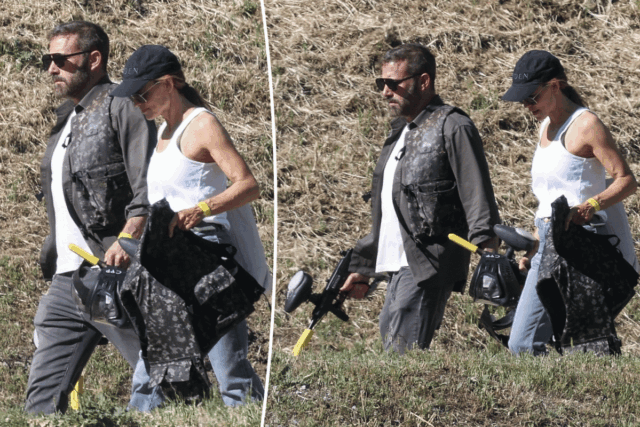 Garner teneva la testa bassa mentre Affleck guardava dritto davanti a sé mentre trasportavano la loro attrezzatura.