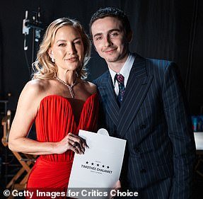 Timothee Chalamet ha ottenuto il premio come miglior attore per Marty Supreme mentre posa con Kate Hudson