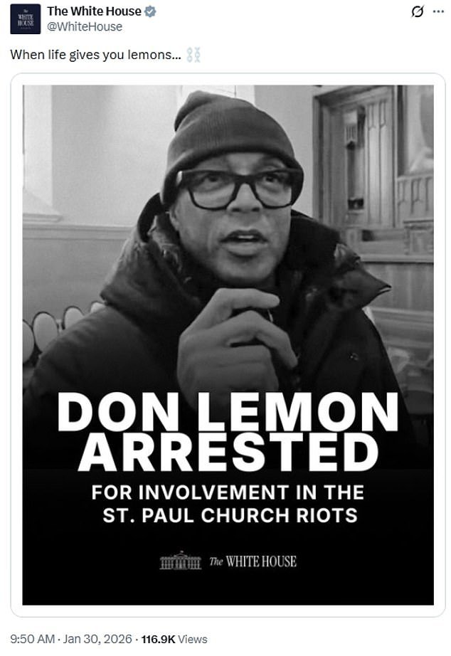 La Casa Bianca ha deriso Don Lemon dopo che è stato arrestato a Los Angeles venerdì mattina per essersi unito ai manifestanti pro-immigrazione che hanno preso d’assalto una chiesa del Minnesota, scrivendo: “Quando la vita ti dà limoni…”