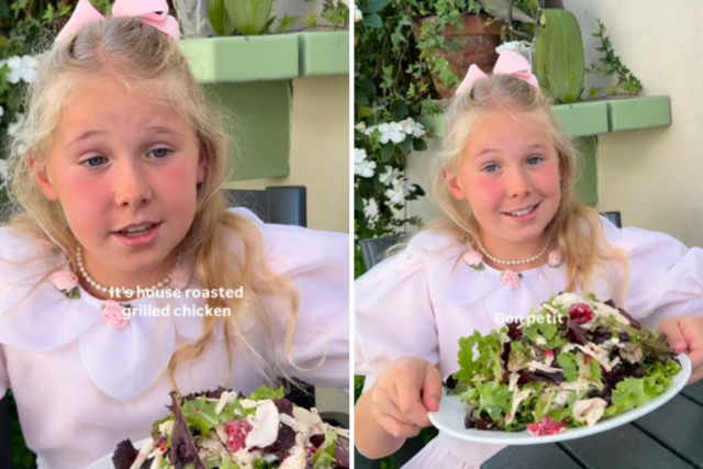 La quarantenne Gretchen Adler (@gretchy) ha filmato sua figlia Arabella elencando cosa c’è nel suo piatto: un’insalata di giardino condita con pollo grigliato arrosto fatto in casa, salsa a base di olio d’oliva, lamponi e verdure a foglia verde.