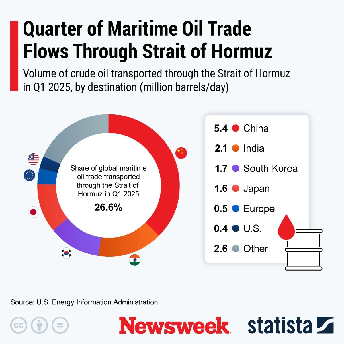 Secondo la US Energy Information Administration, la quota del commercio marittimo globale di petrolio trasportato attraverso lo Stretto di Hormuz nel primo trimestre fiscale del 2025 è stata del 26,6%.