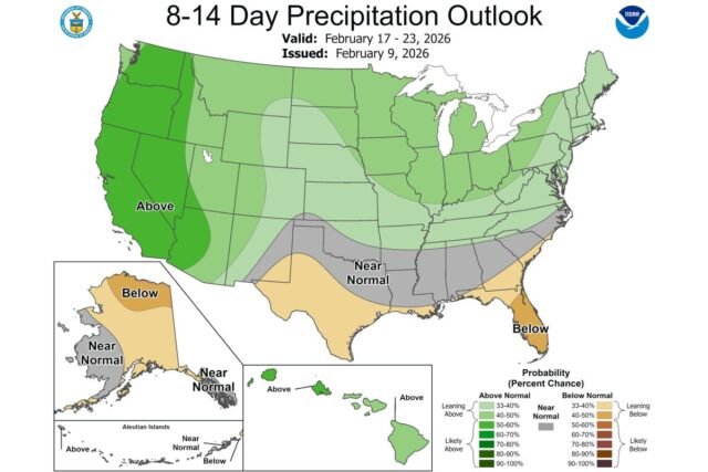 Una mappa delle previsioni per il periodo dal 17 al 23 febbraio ha mostrato le probabilità più elevate di precipitazioni superiori alla norma in California, Washington, Oregon, Idaho, Nevada e Arizona.
