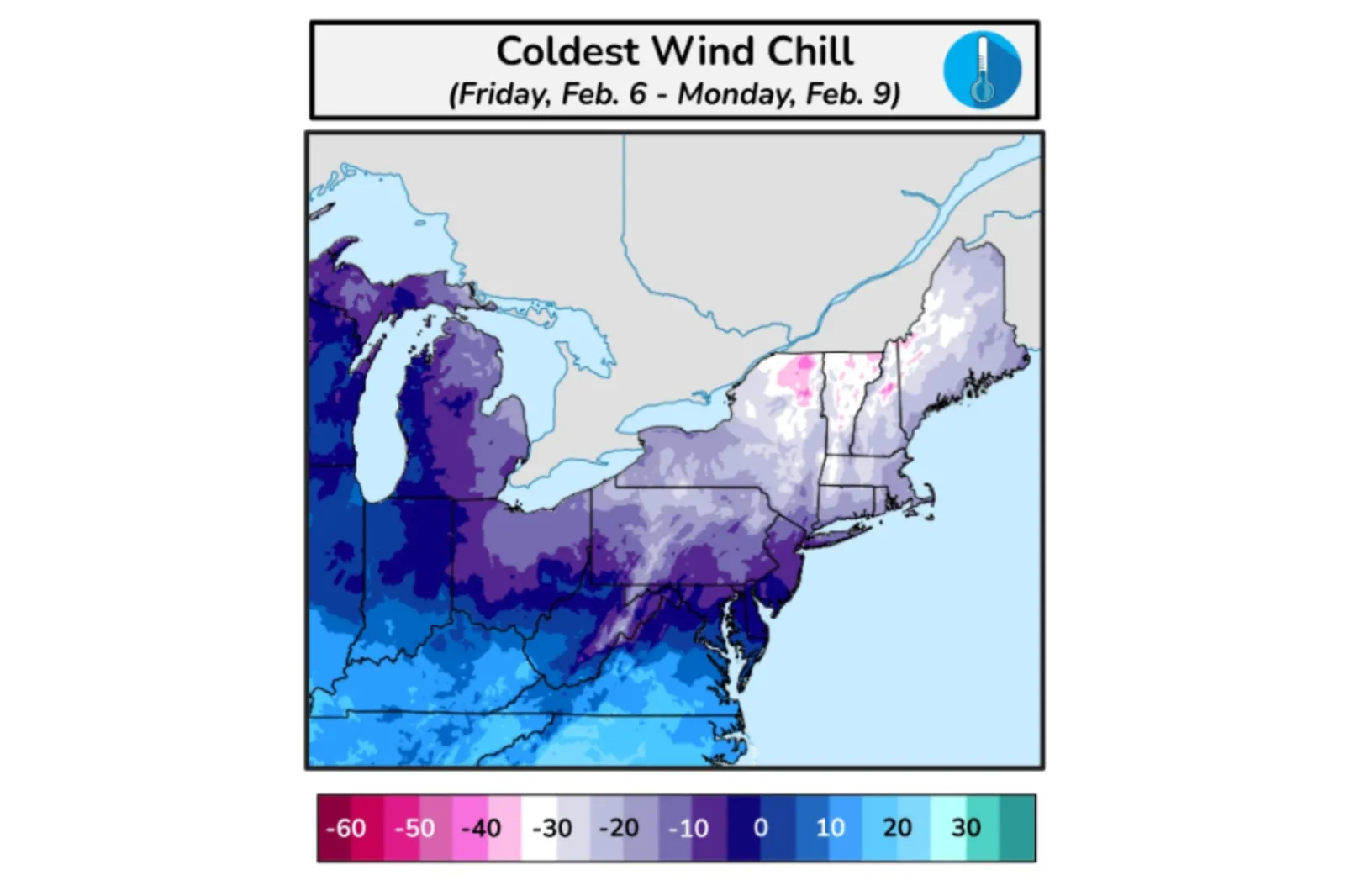 Una mappa previsionale dell’agenzia indica che gli stati che affrontano i venti gelidi più freddi da venerdì a lunedì includono parti di New York, Vermont, New Hampshire e Maine.