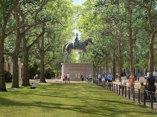 Le precedenti impressioni dell’artista per un nuovo memoriale nazionale al defunto monarca mostravano una grande statua della regina a cavallo su un imponente piedistallo di pietra