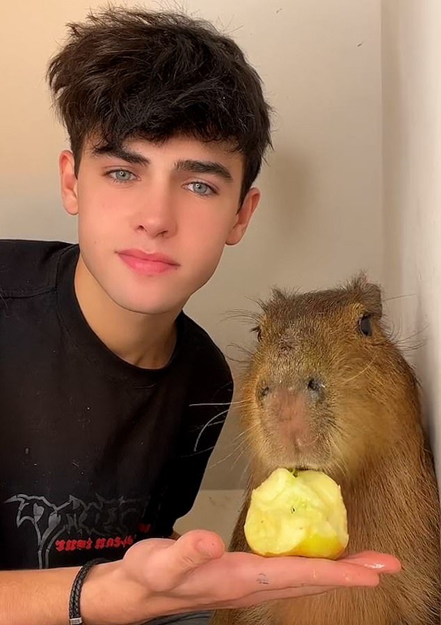 Kyle Thomas con il capibara che sua madre ha portato di nascosto dal Cambridgeshire all’Irlanda del Nord
