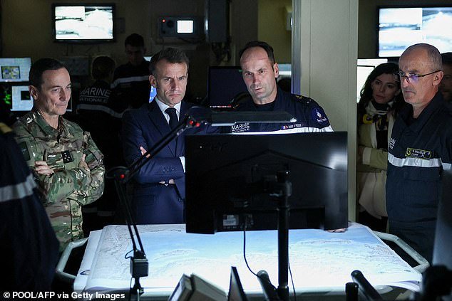 Emmanuel Macron ha ordinato alle navi della marina francese di raggiungere lo Stretto di Hormuz in un tentativo “senza precedenti” di combattere l’impennata dei prezzi del petrolio (il presidente francese, al centro a sinistra, è raffigurato lunedì sul ponte di una nave da guerra)