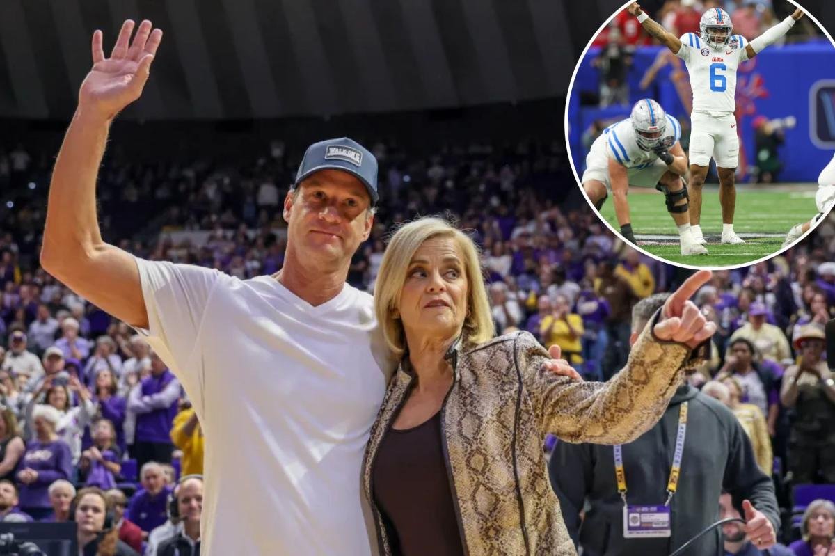 L’allenatore di football polarizzante è uscito con Mulkey, i due tenendosi per mano, e ha salutato la folla a Baton Rouge. Mulkey ha alzato il braccio sinistro in aria e ha indicato Kiffin mentre la folla esultava prima di alzare entrambe le braccia.
