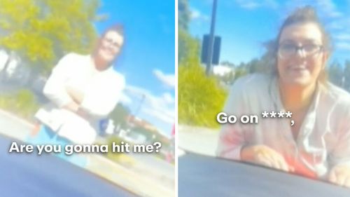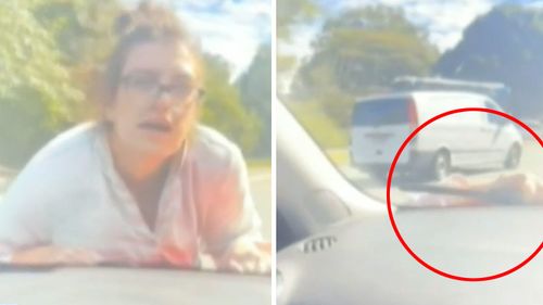 La donna è saltata sul cofano dell’auto prima che Shaw uscisse dal parcheggio e si immettesse su Olsen Avenue a Molendinar. (Nove)