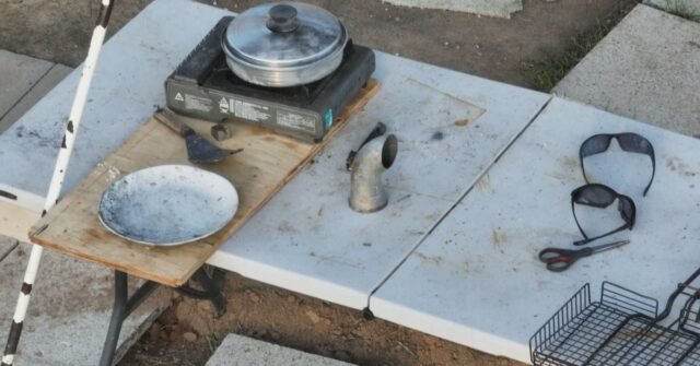 Due paia di occhiali da sole, simili a quelli con cui Freeman era stato fotografato in precedenza, sono stati catturati appoggiati su un tavolo su cavalletto accanto a un fornello portatile e un piatto sporco.
