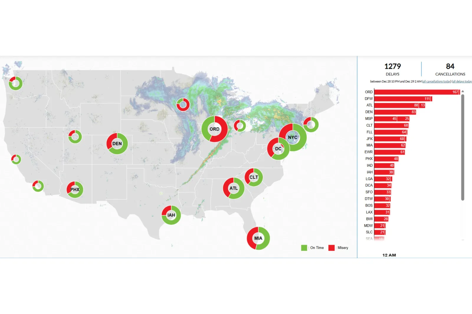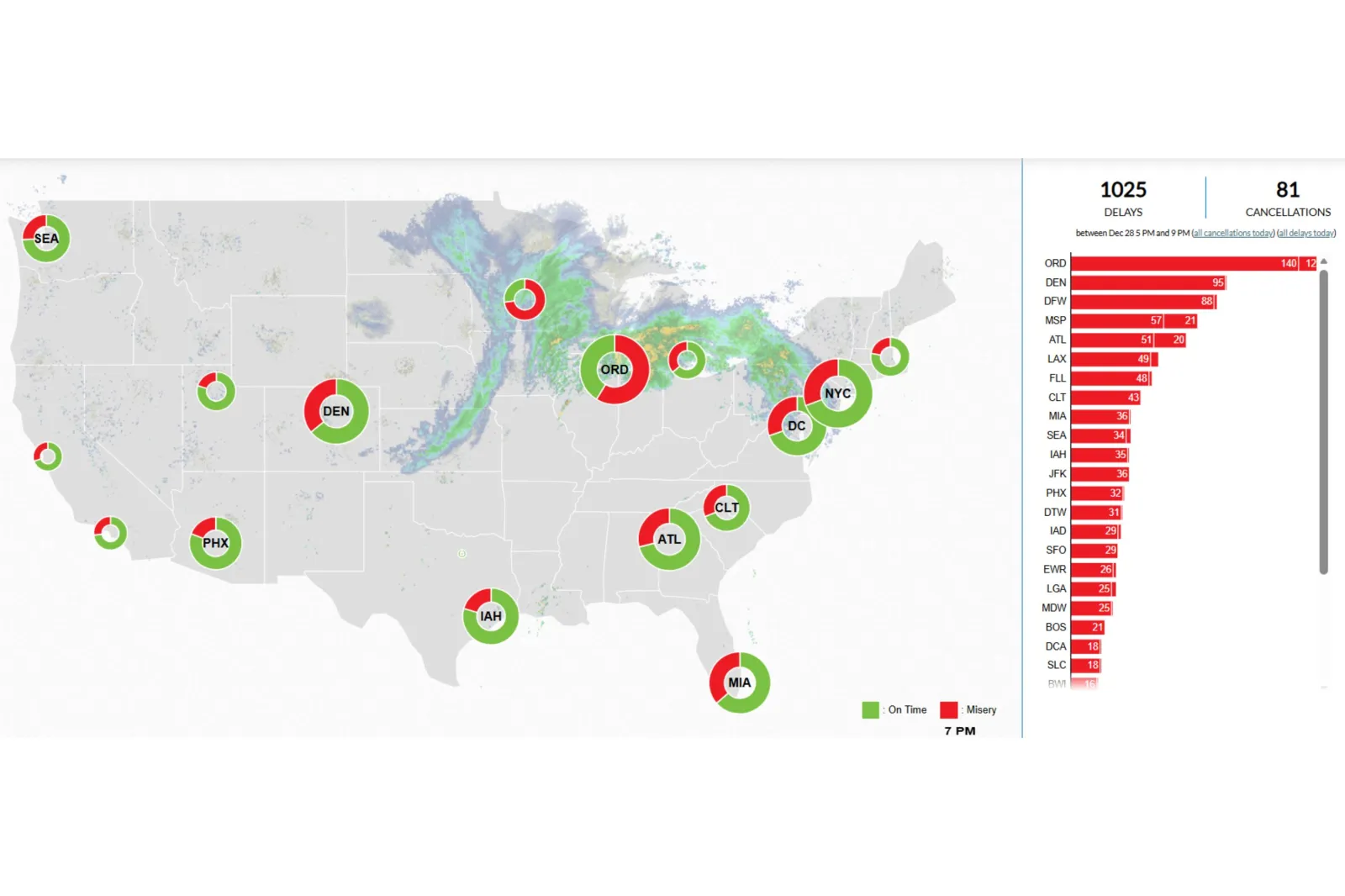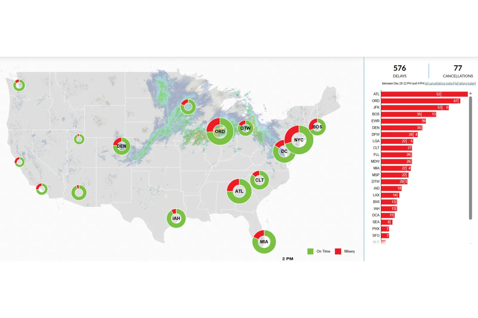 Questo numero è salito drasticamente a 576 ritardi e 77 cancellazioni tra le 7:00 e le 11:00 ET di domenica, come ha mostrato la Misery Map di FlightAware.